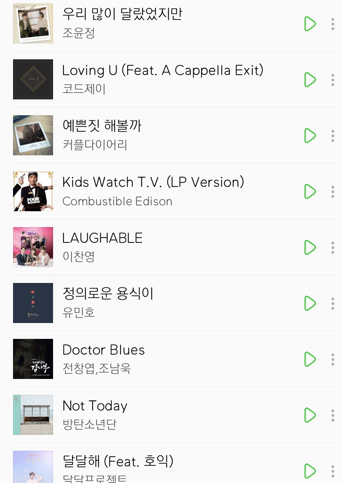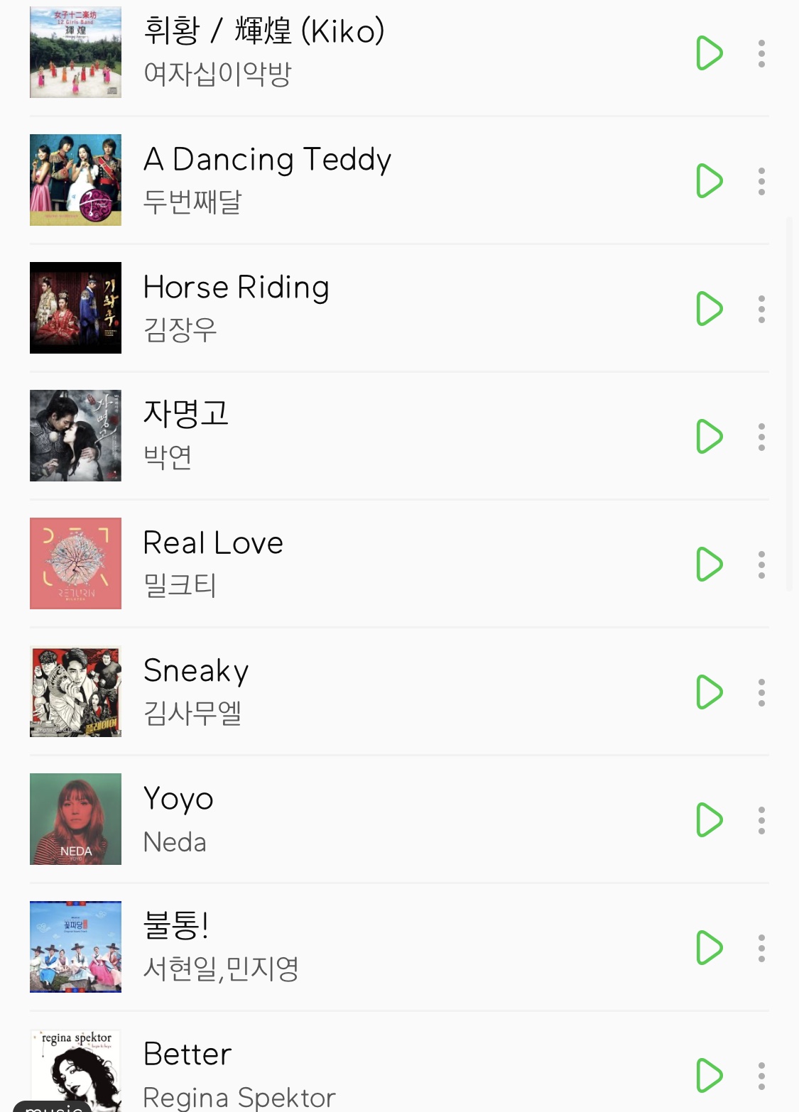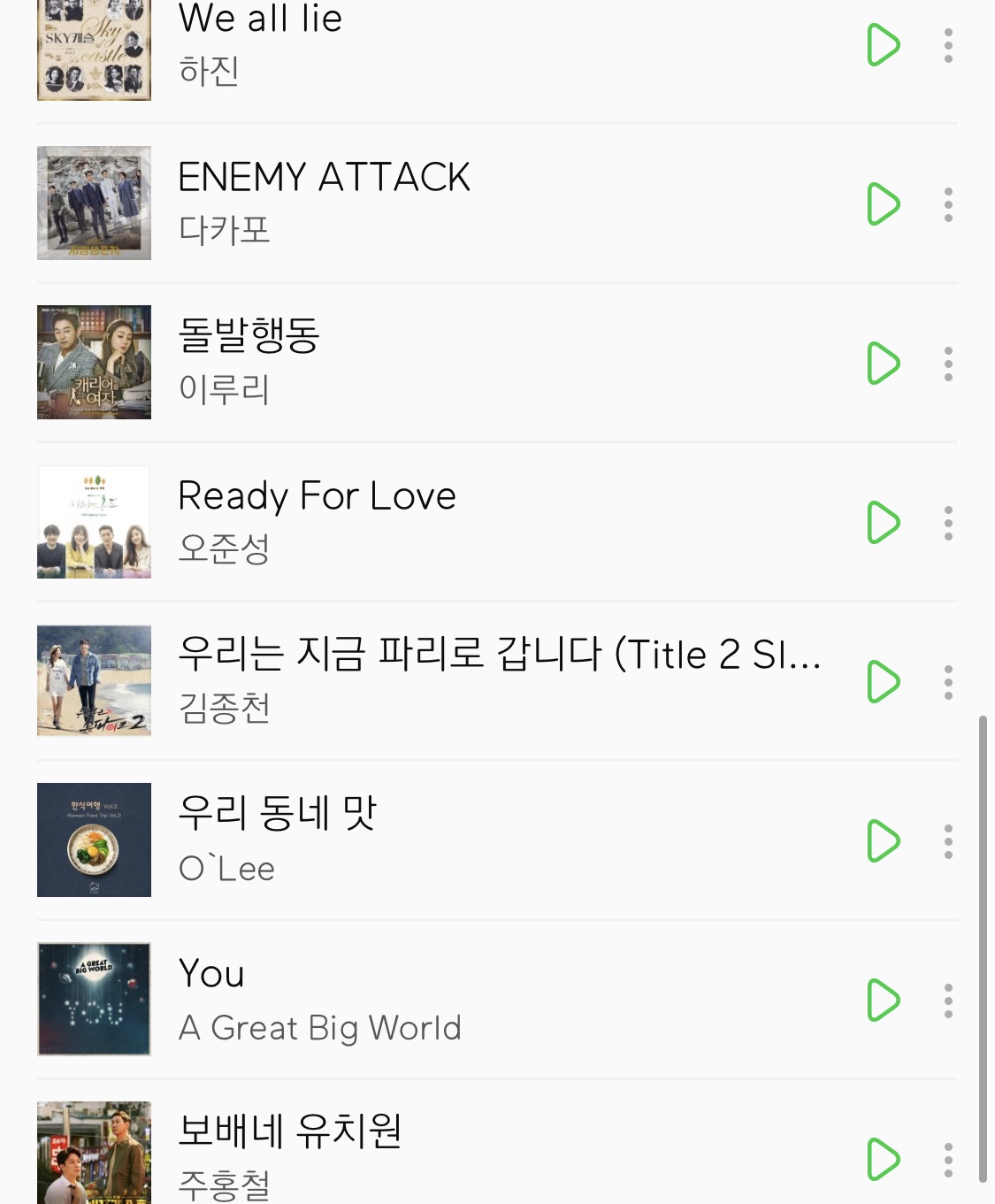 본문 내용에 없는 노래는 대사와 맞물리거나, 소리가 작아서 없어요~~ 나오지 않더라도 너그럽게 이해해주세요! 저도 제가 선택한 노래들이 아니라서 잘 모른답니다..,.,.,! 그래도 찾으시는 노래가 저 리스트 안에 있길 바라면서